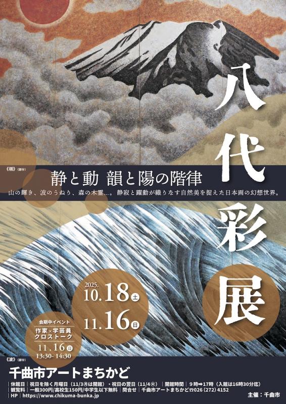 千曲市のアートまちかどでは、『八代彩展―静と動 韻と陽の階律―』を10月18日(土)より開催する。日本画家、八代彩(やしろ さい)は、約70年に渡り、卓越した画力、繊細かつ迫力に満ちた表現で、自らが魅せられた自然の姿を描いてきた。山の輝き、波のうねり、森の木霊など、静寂と躍動が織りなす自然美は、見る者を幻想世界へと誘う―。東京都出身で千曲市倉科在住の八代氏は御年92歳、地元・千曲市での大きな個展は初めてだったが、開催直前の8月に急逝。八代氏が参加予定だった学芸員とのトークは、弟で同じく日本画家(日本美術院同人)、千曲市名誉市民の倉島重友氏が特別ゲストとして参加することになり、「八代彩を偲んで~その作品世界と日本画の魅力」をテーマにおくる。「八代の想いが伝わる展覧会に」と学芸員らスタッフは悲しみのなか決意を新たに会期を迎える。深い味わいに満ちた日本画の幻想世界を、ぜひ体感してほしい。また特別展示として「丹浪・彩・美友・重友―日本画一家の系譜―」を同時開催。