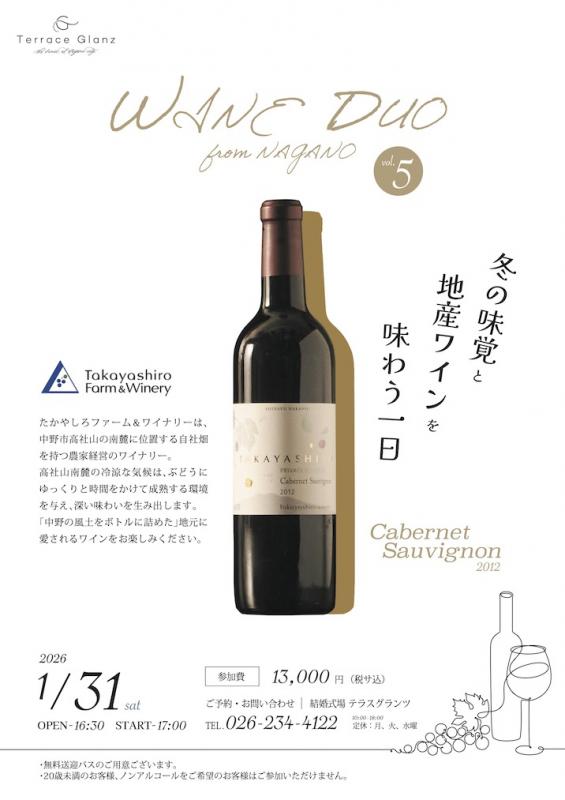 地元ワイナリーのワインと季節の食を楽しむ、テラスグランツのワイン会『WINE DUO from Nagano』が1月31日に開催される。5回目を迎える今回のパートナーワイナリーは、中野市の「『たかやしろファーム&ワイナリー』。中野市の高社山の南麓に自社畑を持つ農家経営のワイナリーで、「中野の風土をボトルに詰めた」と言われる深い味わいが特徴だ。吟味された冬の食材が織りなす、和彩フレンチとのペアリングを楽しんで。