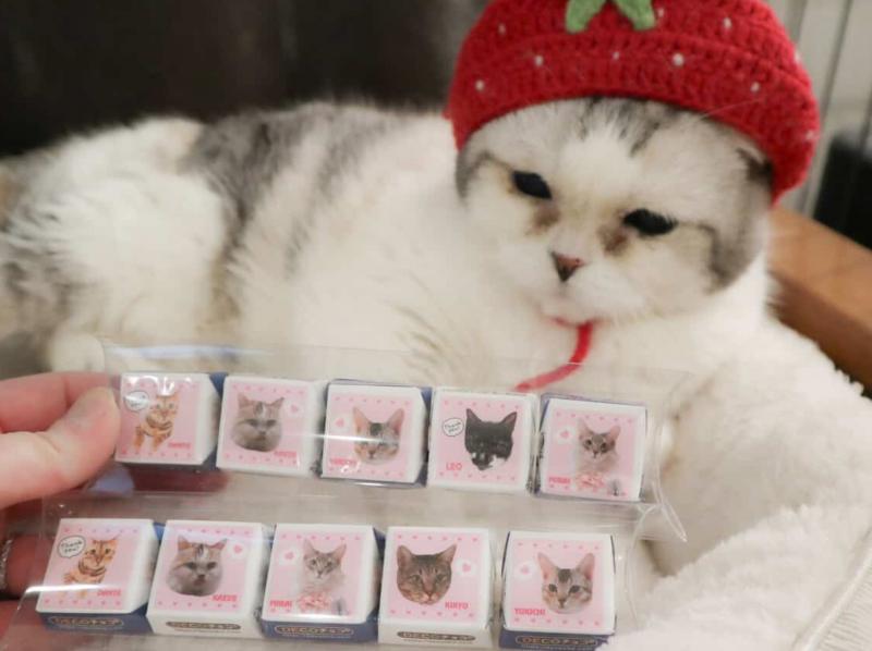 ねこちゃんも見つめる「バレンタインチロルチョコ(5種類5個入りセット1120円)」