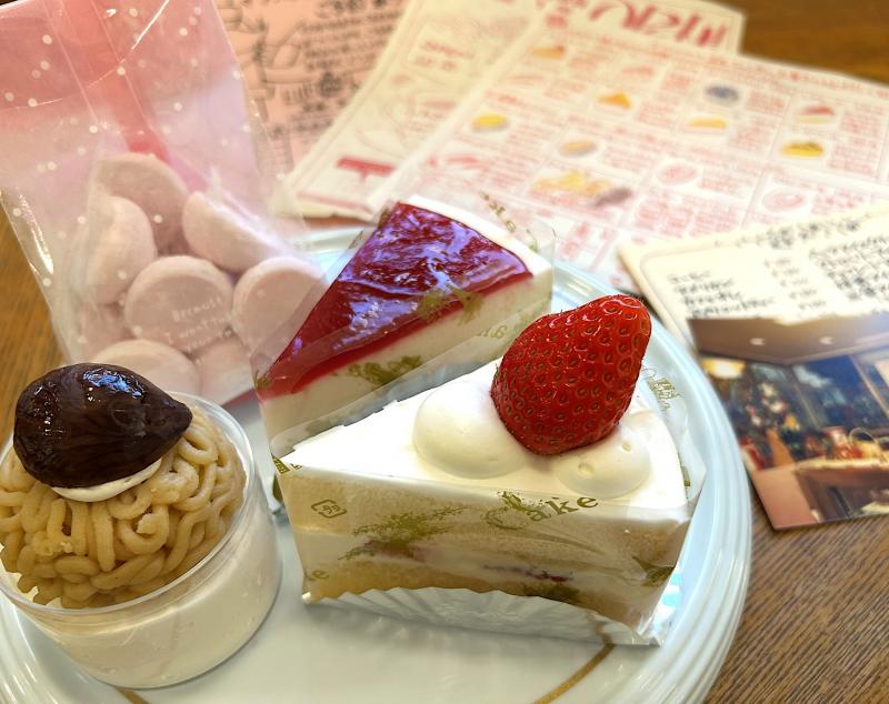 人気のモンブラン、イチゴケーキ、レアチーズケーキ(各400円)、ラズベリーギモーヴ(540円)。懐かしの店舗チラシと共に