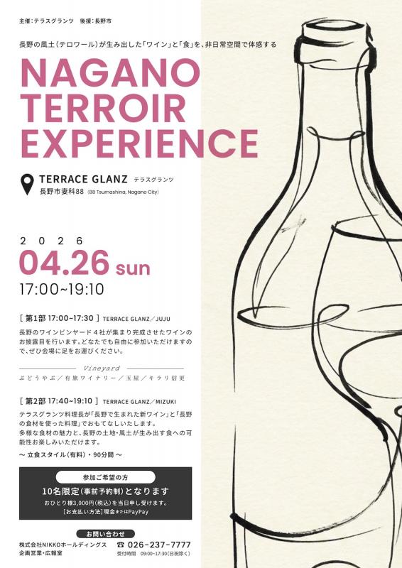 長野市で作られた新作ロゼワイン「ナガロゼ」を地元食材で作られる料理と楽しむワイン会)「NAGANO TERROIR EXPERIENCE」が、妻科のテラスグランツで4/26(日)に開催、参加者を募集している。長野市ワインぶどう生産者4社とテラスグランツが協働し、ロゼワイン「ナガロゼ」を開発・発信する「長野市ワインプロジェクト」による企画イベントで、「新作ロゼワイン」は初披露となる。テラスグランツ料理長が手がける信州食材とのペアリングでは、鹿肉バーガーや旬の野菜を使った多彩な料理とともに、ワインとの新たなマリアージュを。ワインと食を通じて、長野市の魅力を再発見できそう! 非日常の空間で広がる“長野の物語”を楽しんで。事前予約制につき、下記電話番号へ連絡を。