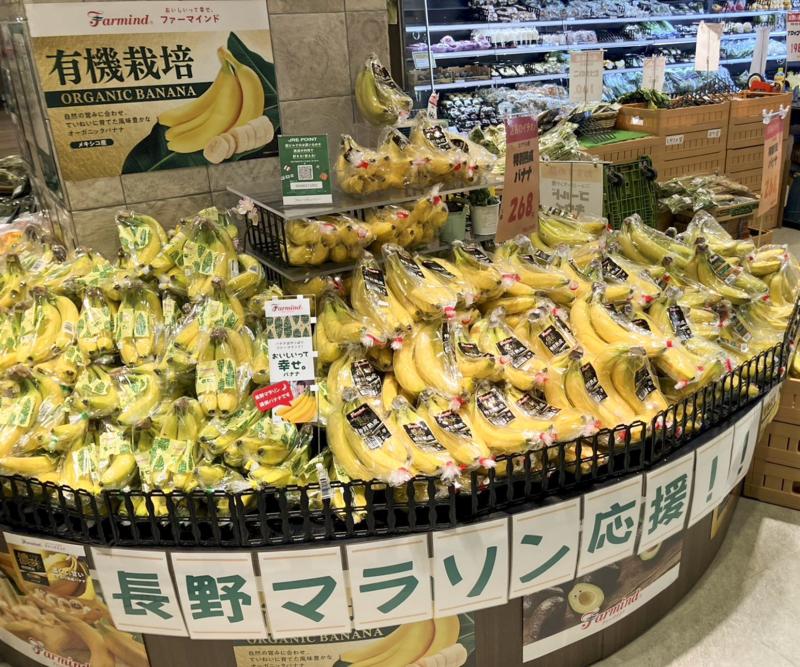 4月19日(日)に開催の「第28回長野マラソン」を盛り上げるフェアを、株式会社R&Cながの青果の子会社である「フルーツカンパニー(MIDORI長野1F)」が4月13日(月)~4月26日まで開催中。1999年の長野マラソン初開催以来、商社と連携し、給水所でのバナナを協賛してきたこともあり、今回のフェアでも大会提供のバナナ(ファーマインド社)の販売、大会ポスター・写真等の掲出、旬の果物・野菜の販売等が行われている。気軽に出かけてみよう。