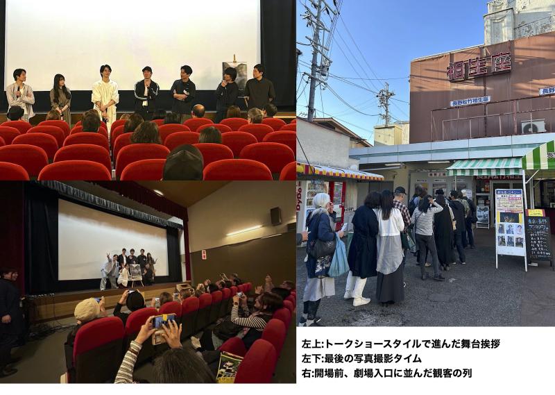 長野相生座・ロキシーでは、4月24日(金)より上映の映画『東京ランドマーク』(2024年製作/70分)。25日(土)・26日(日)に、本作の製作・配給を手がけた映像制作ユニット「Engawa Films Project」(2008年結成)のメンバーの柾賢志さん、毎熊克哉さん、林知亜季さんと、キャストの藤原季節さん、鈴木セイナさん、義山真司さん、石原滉也さんが登壇。上映後、およそ180名の来場者を前に2日間にわたり舞台挨拶が行われた。