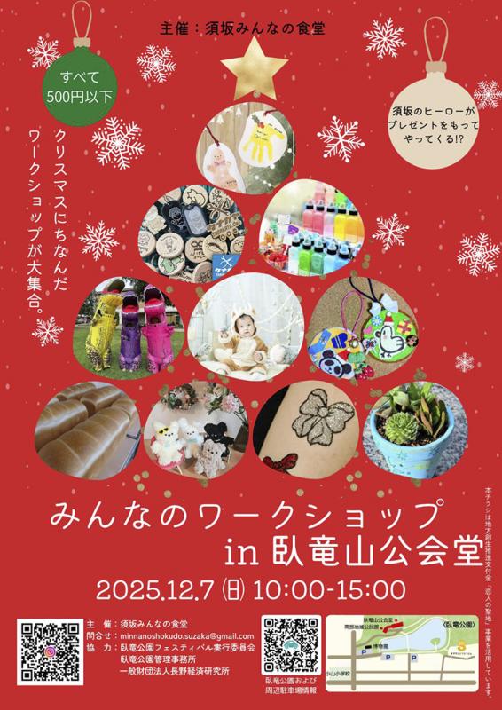 クリスマス近し。今年もあと少し。なにかと気ぜわしいけれど、ちょっと一息お手軽・お気楽なワークショップ大会はいかが。材料費込みの受講料は、高くても500円。大きく4つのセクションに分かれており、大人から子どもまで、親子で楽しめるラインナップ。お昼やおやつは、充実のフードブースで。食べすぎにご用心。大きな会場ならではのチアダンスやクイズ大会、そして須坂のヒーローが…お楽しみ。詳しい情報はインスタ @minnanoshokudo.suzaka で。月イチ開催「須坂みんなの食堂」は毎月第4金曜日。