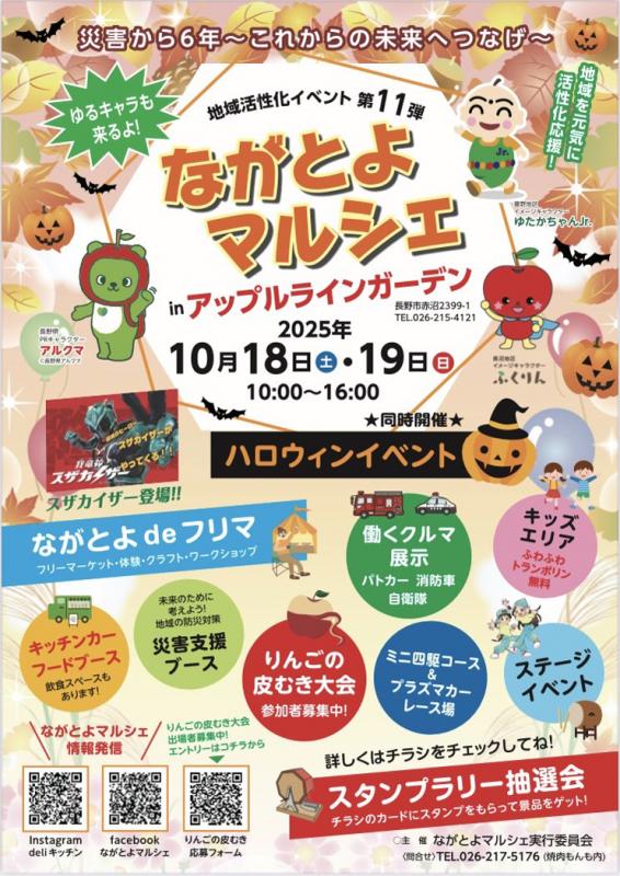 信州新町の魅力を発信する恒例イベント。会場ではジンギスカンやサフォークソーセージをはじめ、信州新町の特産品を中心とした販売ブースが並び、流木工作、はた織り、消防車乗車などの体験コーナーも。10月11日(土)11:30~和太鼓演奏、12日(日)11:00~キッズダンス・12:00~馬頭琴が演奏され、にぎやかに。