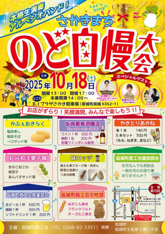 天高く馬肥ゆる秋。芸術の秋。そして食欲の秋。坂城町で初めて開催される「のど自慢大会」に注目。生バンド演奏だからひと味違う。スペシャルゲストのライブも聞き逃せない。そして、もうひとつのお楽しみ、フードブース。どちらがメインかわからなくなるほどの充実ぶり。町内の名店が勢ぞろい。ここでしか食べられない「ねずこん焼き」は外せない。秋のひととき、坂城町に行ってみよう。