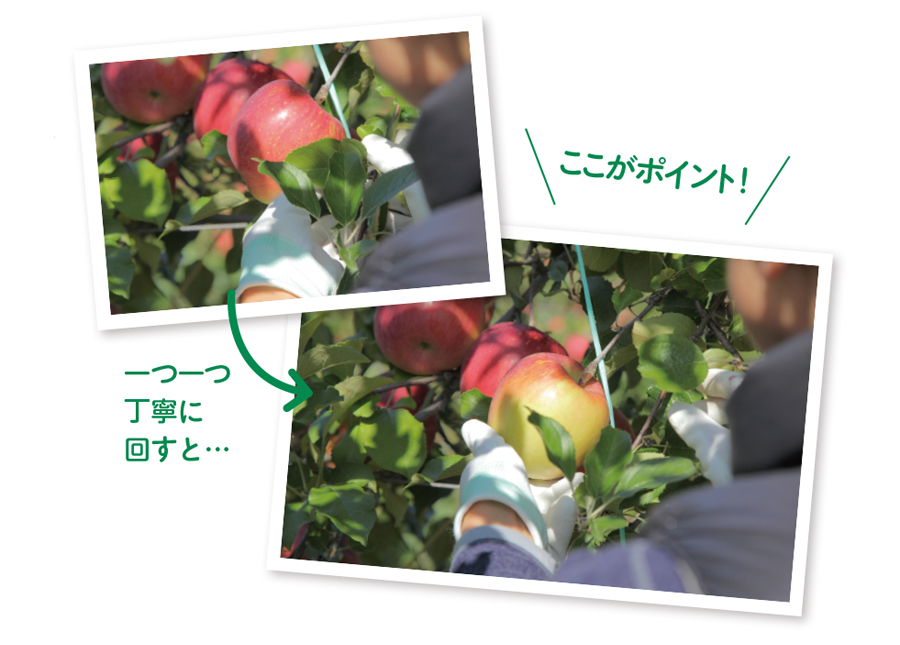「葉摘み」と「玉まわし」で着色していない部分にまんべんなく日光と風を当て、真っ赤に色付いたりんごは、お尻の部分があめ色になったものが適熟の印。収穫も一度にするのではなく、蜜がしっかり入っておいしく熟したものから適期収穫していきます。