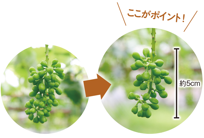 5cmほどの房に密集した粒を先の細い専用のハサミで切り落とします。摘粒することで、実が大きくなってもお互いに押し合うことなく、丸くてきれいな実に育ちます。余計な実が付いている時期が長いほど栄養が分散してしまうので、摘粒はできるだけ実の小さいうちに行います。