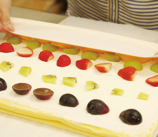 色とりどりのフルーツをたっぷり巻き込んだ「フルーツロール」は、15年以上前からたむらの洋菓子の定番として、多くのお客様に愛されています。