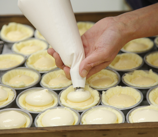 中に詰めるカスタードクリームは、オブセ牛乳と飯山みゆき卵の黄身、砂糖、生クリーム、バニラビーンズであっさりと仕上げたもの。生地に詰めた後にもう一度蒸すことを考慮して、意図的にゆるく仕上げています。洋菓子で使われるカスタードクリームのようにバターなどの油分を入れないので、あっさりとした優しい甘味が特徴。蒸し上がった時にちょうどいい口あたりになるよう計算されています。