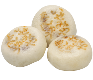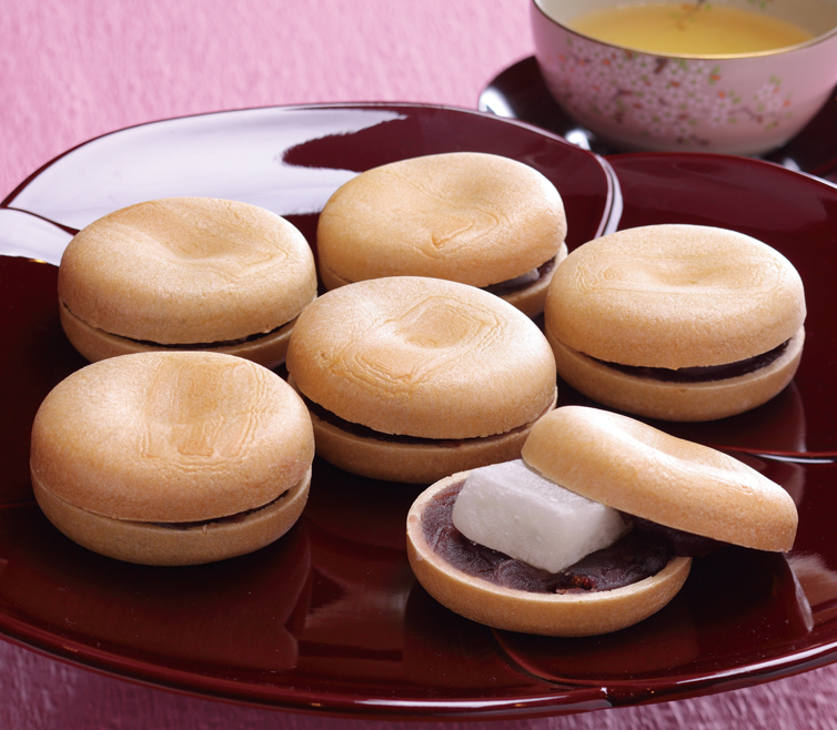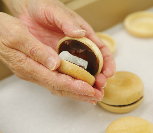 まあるい形がまさしく円満を表している、たむらの銘菓「円満」。たむらが県町で菓子店を始めた当初からある、歴史あるお菓子です。丹波の大納言をゆっくりゆっくり時間をかけて丁寧に炊き上げ、かのこ豆に。それを北海道産の小豆で作ったこし餡に加えることで、なめらかさの中にかのこ豆の粒感が感じられる絶妙な小倉餡に仕上げます。最後に寒天でつやを出した小倉餡を丸い最中の皮にたっぷりと詰め、その真ん中に置くのは、手作りの求肥です。