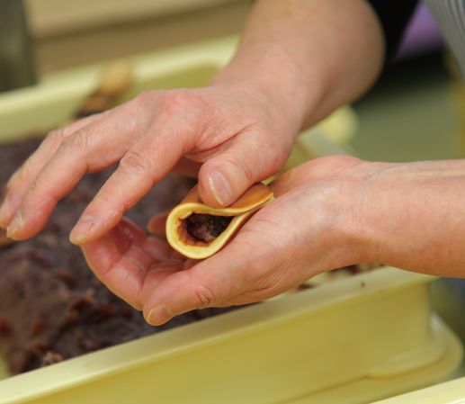 しっとりと柔らかでありながら食べ応えのある皮は、国産のもち米を配合したもの。どらやきの皮と比べて膨らみにくく焼きの時間もかかるため、職人の技が光ります。焼き上げた皮を一枚一枚、素手で受け止め確認することで、あのもちもちとした美味しい皮が仕上がるのです。