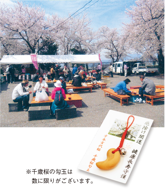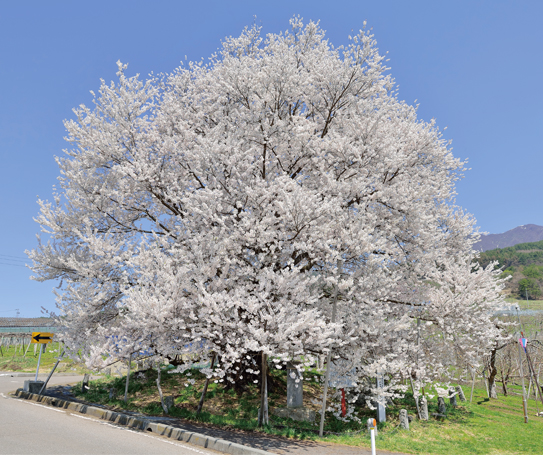 北信州・山ノ内町の宇木地区で生まれ育った自分にとって、千歳桜はとても身近な存在です。宇木の千歳桜は、1967(昭和42)年に長野県の天然記念物に指定されたエドヒガンザクラで、推定樹齢約900年といわれています。その昔は「月見桜」「見返り桜」などと呼ばれていましたが、1928(昭和3)年に天皇御大典を記念して「千歳桜」と命名されました。900年前といえば平安時代。遥か古より今日まで、宇木の地を守り続けてきた桜なんです。地区には保存会があり、毎年春には観桜会が開催されています。観桜会では、千歳桜の下に祀られている桜下農蚕神社で農作物の繁栄を願う祭礼を執り行った後、区民が専用の浴衣や法被を着て、千歳桜小唄の踊りを奉納します。子どもの頃からずっとこの風景を見てきた私たちにとって、千歳桜は暮らしと密着した大切な宝です。