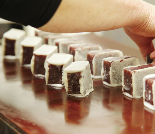 たむらのきんつばは、北海道産小豆を用いたきんつば専用の餡が命。ふっくらと煮あげた小豆を、寒天と水、砂糖とともにじっくりと炊いていきます。餡は基本的に糖度で仕上がりを確認するのですが、きんつば用の餡は、豆の様子を目で見ながら職人の技で仕上げます。できるだけ小豆をつぶさないよう優しく丁寧に炊いた珠玉の餡は、小豆本来の美味しさを感じていただくことができます。