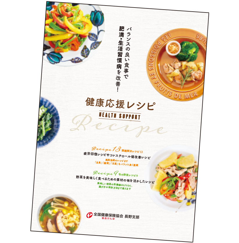 協会けんぽでは、当協会に加入された皆さまがより健康で充実した毎日を過ごせるよう、健康レシピ集を製作しました。肥満や生活習慣病の予防・改善、美肌効果や旬の野菜を使ったメニューを掲載した「健康レシピ集」をぜひ活用してください。