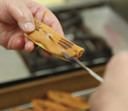 たむらの「鮎焼き」は、求肥だけの関西系。どらやきよりも緩い生地に国産生姜の搾り汁を入れたものを、職人が一枚一枚丁寧に手焼きしています。焼き過ぎると求肥をうまく包めなくなるため、生地を返すタイミングを見定めます。
