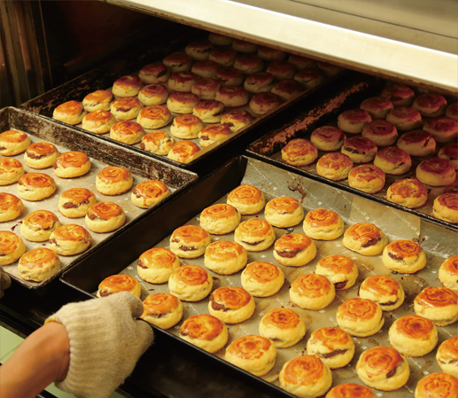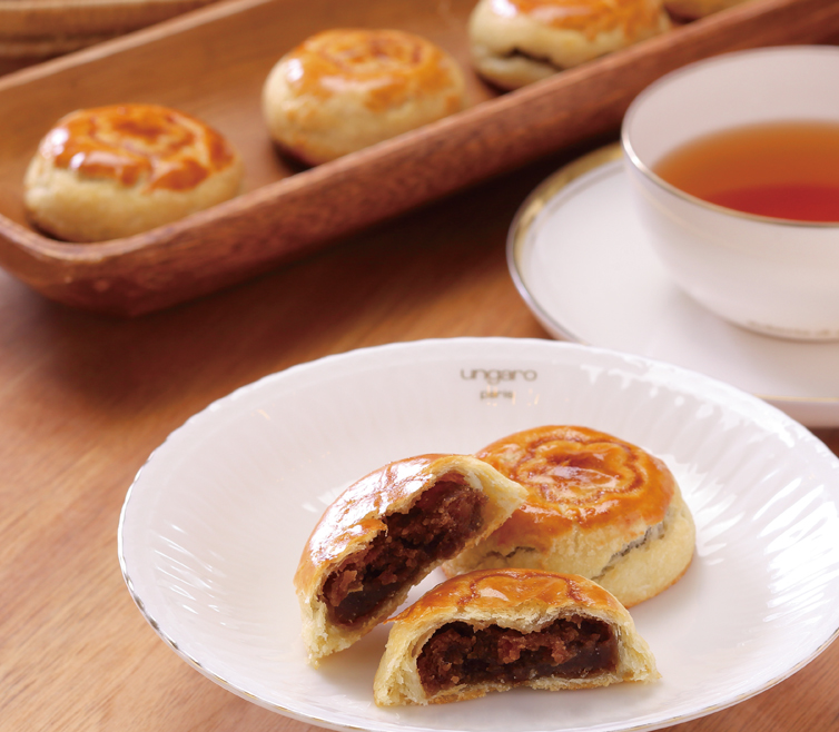 餡は三温糖と黒糖をブレンドして練り上げた、たむらオリジナルのこし餡。食感が残るように手で荒く刻んだ杏を、餡にたっぷりと混ぜ込みます。甘酸っぱい杏に合う餡を探求し、黒糖にたどり着きました。杏独特の香りと酸味に、コクのある黒糖がよく合います。こだわりの杏餡を包み込むパイ生地は、長野県産小麦に発酵バターをふんだんに配合。さっくりと軽い食感になるようにまとめたら杏餡を包み、可愛らしい杏の花印をぽんっと押します。卵黄で艶を出して230℃の高温で一気に焼き上げれば、芳醇な香りが一面に広がります。