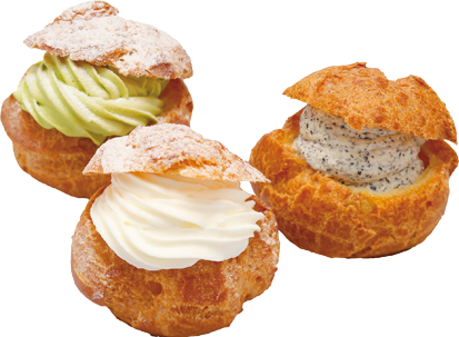 • たむら定番の3種のシュークリームもシュー生地が一新。新鮮なフレッシュクリーム、優しい甘さの抹茶、黒ゴマの風味豊かなごま。