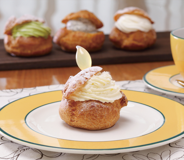 シュー生地のリニューアルとともに、新しいシュークリームも登場しました。その名も「クリームチーズとはちみつレモンのシュークリーム」。デンマーク産のクリームチーズとフレッシュクリームを合わせたオリジナルのチーズクリームをシュー生地にたっぷりと詰め、アクセントに松代養蜂場の蜂蜜を使った「はちみつレモン」のスポイトを刺しました。