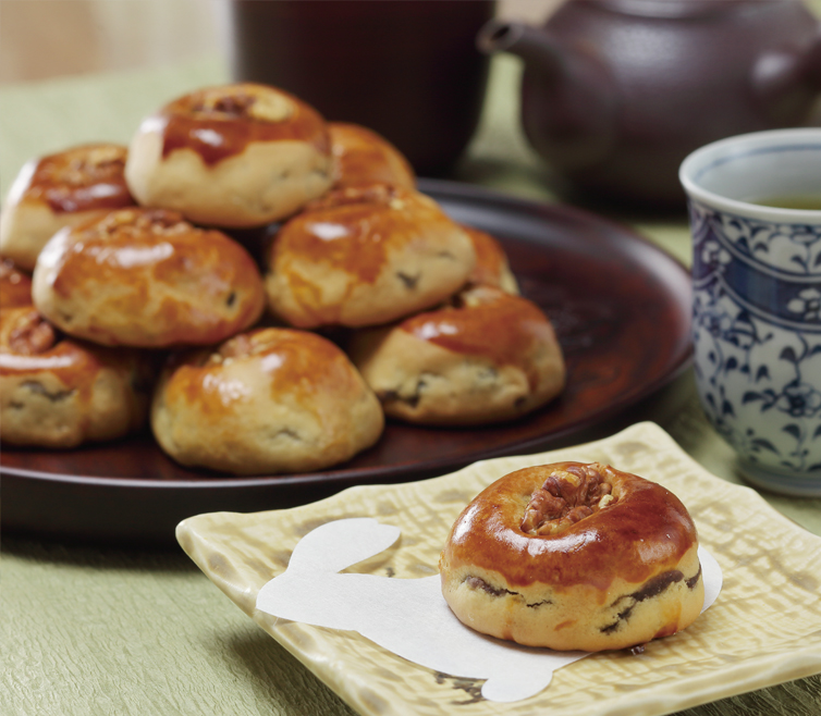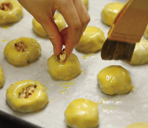 味の決め手となる大きなクルミは、県内産を使用。手作業で丁寧に取り出した実の4分の1を、贅沢に乗せていきます。上質で雑味の全くないクルミは、前日にローストすることで油を活性化。優しい口あたりの餡と皮に香ばしいアクセントを加えます。