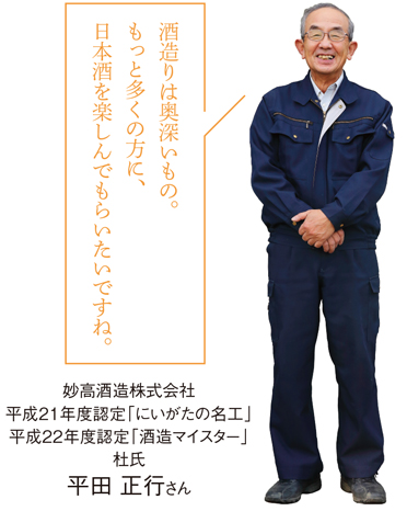 地元頸城の越後杜氏である平田正行は、「にいがたの名工」「酒造マイスター」の両認定を受けた妙高酒造が誇る杜氏。38歳という若さで妙高酒造の杜氏となり、今日に至るまで、その技と知識に磨きをかけてきました。