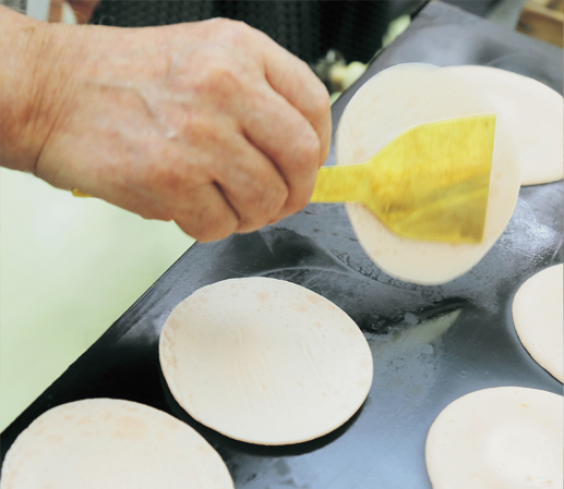桜の花を思わせる薄紅の皮は、小麦粉、砂糖のほか、食べたときにもちっとした食感が感じられるよう、もち米の粉を配合しています。さくら餅の皮は薄紅の美しさが命なので、焦がしたら意味がありません。職人が一枚一枚丁寧に低い温度で手焼きすることで、優しいピンク色の皮に仕上がります。