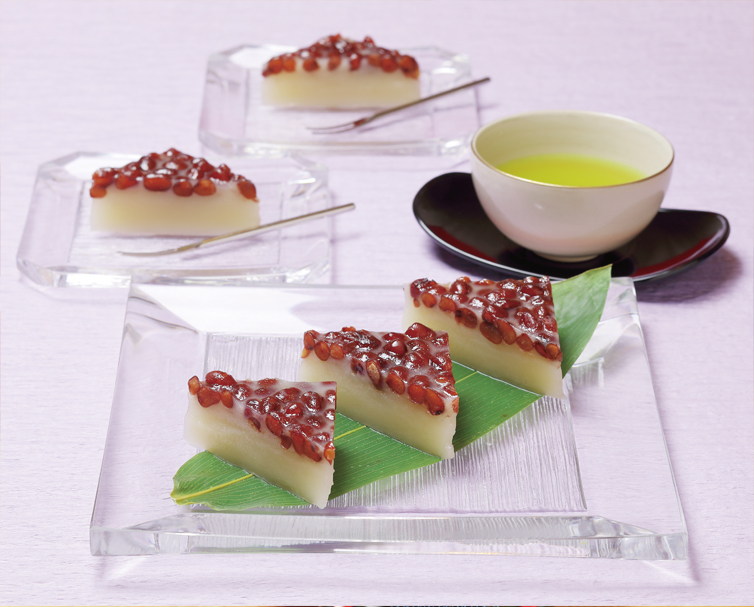独特な三角の形は、平安時代に行われていた「氷室の節句」で、氷室から氷を切り出して食した宮中の風習からきているとか。三角形の白いういろうは、この氷を模したとも、四角を半分にしたことで1年の半分を示したともいわれています。また上にのった小豆の赤には、厄除けの願いが込められています。