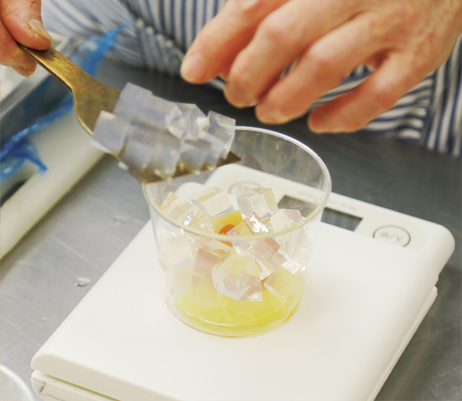 たむらの「フルーツあんみつ」は、川中島白桃や松代産の杏「信山丸」のシロップ漬けのほか、パイン、甘夏の4種のフルーツ入り。そこに賽の目に切った白とピンクの寒天、塩味の効いた赤エンドウマメを加え、氷砂糖で作った優しい甘さのシロップをたっぷりと注ぎます。
