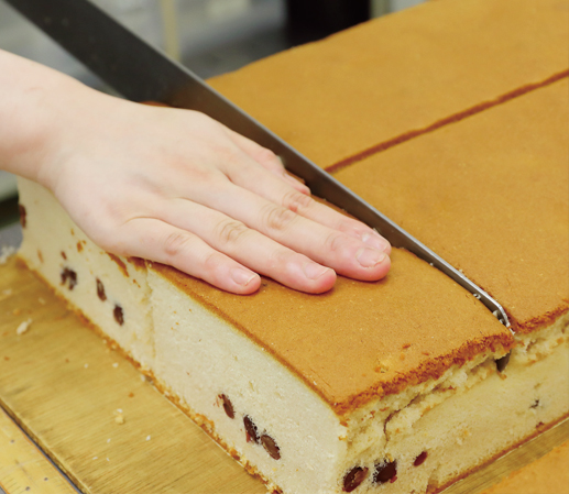 生地が仕上がってからは時間との勝負。カステラ用の木枠に生地を流し込み、丁寧に炊き上げた丹波の大納言を散らします。これを2回繰り返し、生地全体に大納言をたっぷりと加えたら、1時間半かけてじっくりと蒸し焼きにします。
