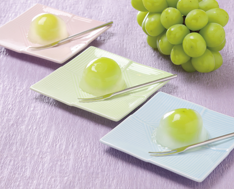 種がなく皮ごと食べられるシャインマスカットは、爽やかなマスカットの香りとしっかりとした甘味が特徴。皮が薄くパリッとした歯切れのよい食感も人気です。そんなシャインマスカットをさらに美味しく味わっていただきたいと試行錯誤し、生み出されたのが、たむらの「水まんじゅう」です。
