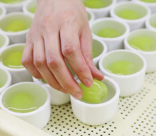須坂の岡木農園さんから仕入れたシャインマスカットを包み込むのは、寒天と砂糖、水だけの混じりけのない味。素材の味を活かすよう、砂糖の甘味は控えめにしてバランスをとります。寒天が熱いうちにボウズと呼ばれる型に流し込み、そこに大粒のシャインマスカットをまるごと一粒。半透明の薄い寒天膜の内側から透けてみえるシャインマスカットのグリーンが、なんとも美しい宝石のような水まんじゅうになりました。寒天のぷるんとしたのど越しのあとに、フレッシュな果汁が口いっぱいに広がります。