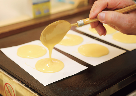 生地は長野県産小麦に飯山みゆき卵、松代の蜂蜜、オブセ牛乳を合わせ、さらに隠し味として抹茶のリキュールを加え、食べた時にふんわりと抹茶の余韻が感じられるようにしました。中に挟む餡は、練乳をベースに炊き上げたオリジナルのミルク餡に、宇治抹茶をたっぷりと加えた「抹茶ミルク餡」。普通の抹茶餡よりも、ほんのりミルキーな味わいで優しい甘さになっています。ここにエアレーションして軽い口当たりに仕上げたカルピスバターを合わせることで、いわゆる「どらやき」よりも、洋菓子にシフトした、「とらの子どらやき」ができました。生地・餡・バターの3つのハーモニーが楽しめると同時に、とら模様や断面の美しさなど、「映え」も意識しています。
