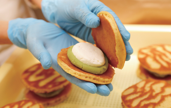 まず、提案されたアイデアは、少ない数をカフェ等で手を加えて提供できるのであれば、とても面白いものでした。しかし流通や品質保持、価格帯、デパートでの販売を考えると、どれも実現は厳しいと判断。その上で、会話の中から出てきた「映え」というキーワードと、抹茶などの「お茶スイーツ」が好きだという3人の意見を取り入れ、普通のどらやきとはちょっと違った見た目の、抹茶系どらやきに絞って試作を始めることにしました。
