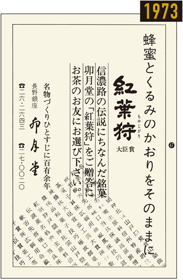 ながの情報2号(1973年2月28日発行)に掲載された広告。第1回和菓子工芸展にて農林大臣賞を受賞した「紅葉狩」を、上品にデザインしています。当時店舗があった新田町は、長野銀座と呼ばれるほど、賑やかな中心街でした。