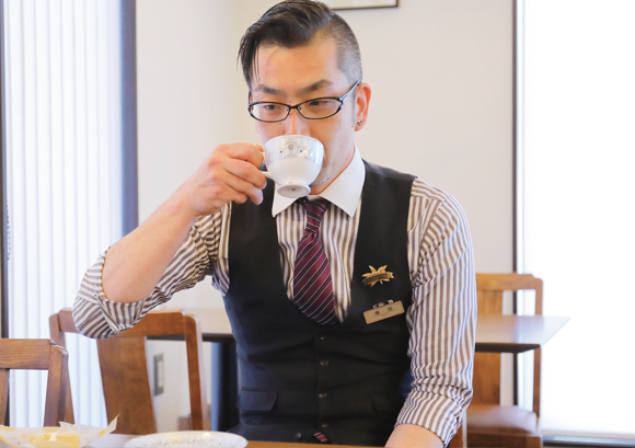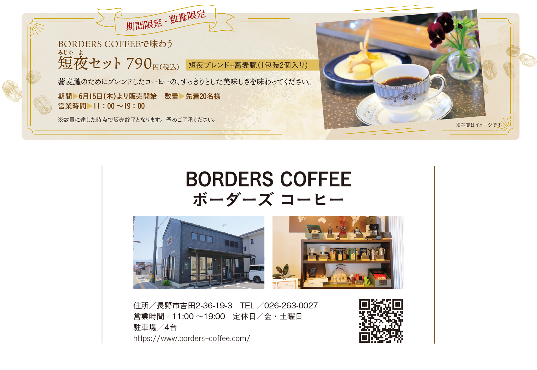 長野大通りを北上し、「湯谷小学校西」の交差点を右に曲がると檀田通りに。その先、「押鐘北」の信号の右手に見える黒い建物が「BORDERS COFFEE」です。店内に入ってまず目に飛び込んでくるのが、美しく焙煎された各国のコーヒー豆。好みのものを選び、目の前で丁寧に淹れられるコーヒーを眺める時間は至福のひとときです。今回は、店主であり焙煎士である傳田明範さんに、蕎麦朧に合うコーヒーを選んでいただきました。