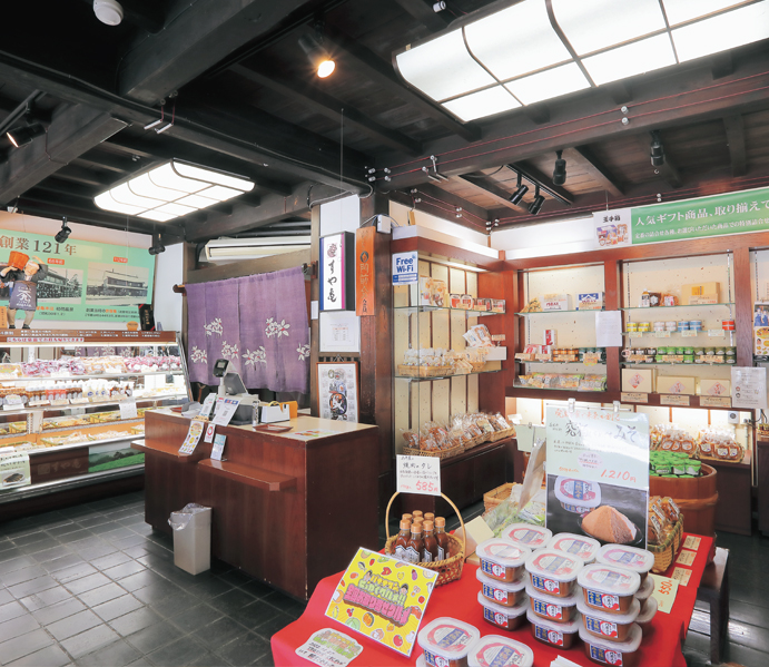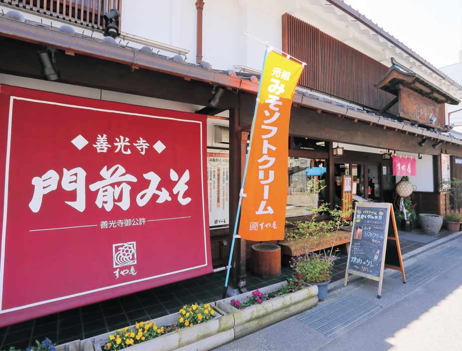 みその加工品も数多く展開していますが、中でも平成元年に販売を始めた「みそソフトクリーム」は、長野のご当地ソフトクリームとして人気になりました。これは現店主が東京に行った際に、当時はまだ珍しかったさまざまな野菜のアイスクリームの存在を知り、「だったら、みそでもできるんじゃないか」と、思い付いたのがきっかけです。試作を開始してから約半年、試行錯誤を繰り返し、すや亀のみそ等3種をブレンドしたベストな配合を見つけ出しました。最初のひと口でふわりとみその香りを感じ、味はまるでキャラメルのような美味しさで、最後にわずかに塩味を感じる「みそソフトクリーム」。今も善光寺お膝元のみそ蔵スイーツとして、また善光寺参りの仲見世の名物として、多くの皆さまに愛されています。販売から30年以上経ちますが、先日も全国放送のテレビで取り上げていただき、とても嬉しかったですね。