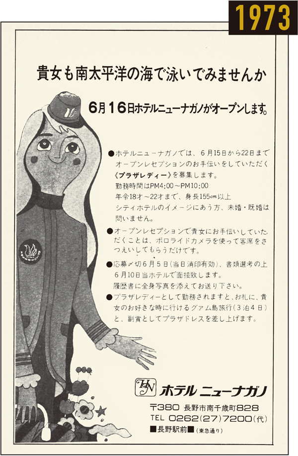 ながの情報6号(1973年5月30日発行)に掲載。6月16日のオープンに向け、レセプションのための《プラザレディー》というスタッフ募集広告を掲載しています。採用されるとグアム旅行プレゼントという発想に驚かされます。