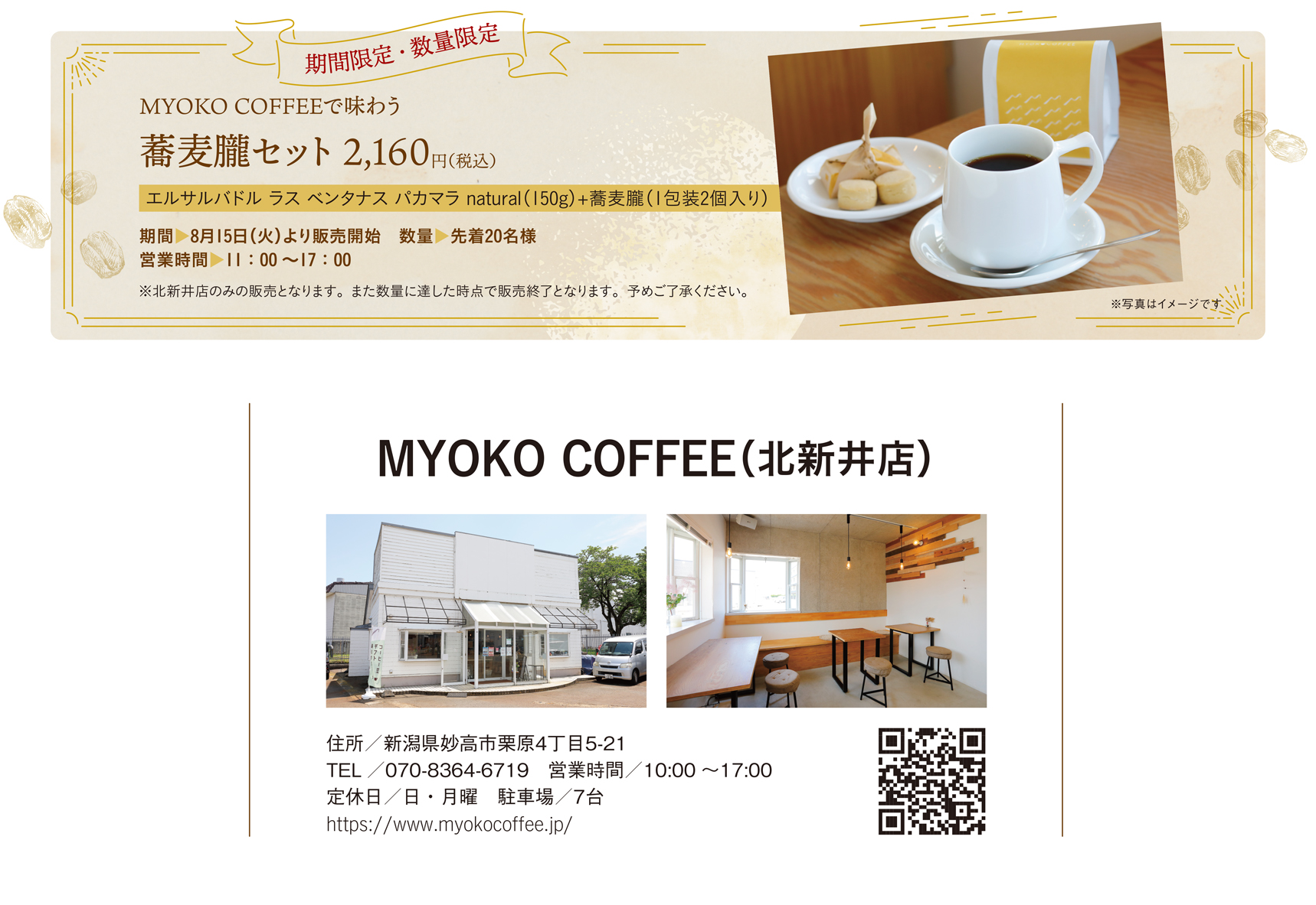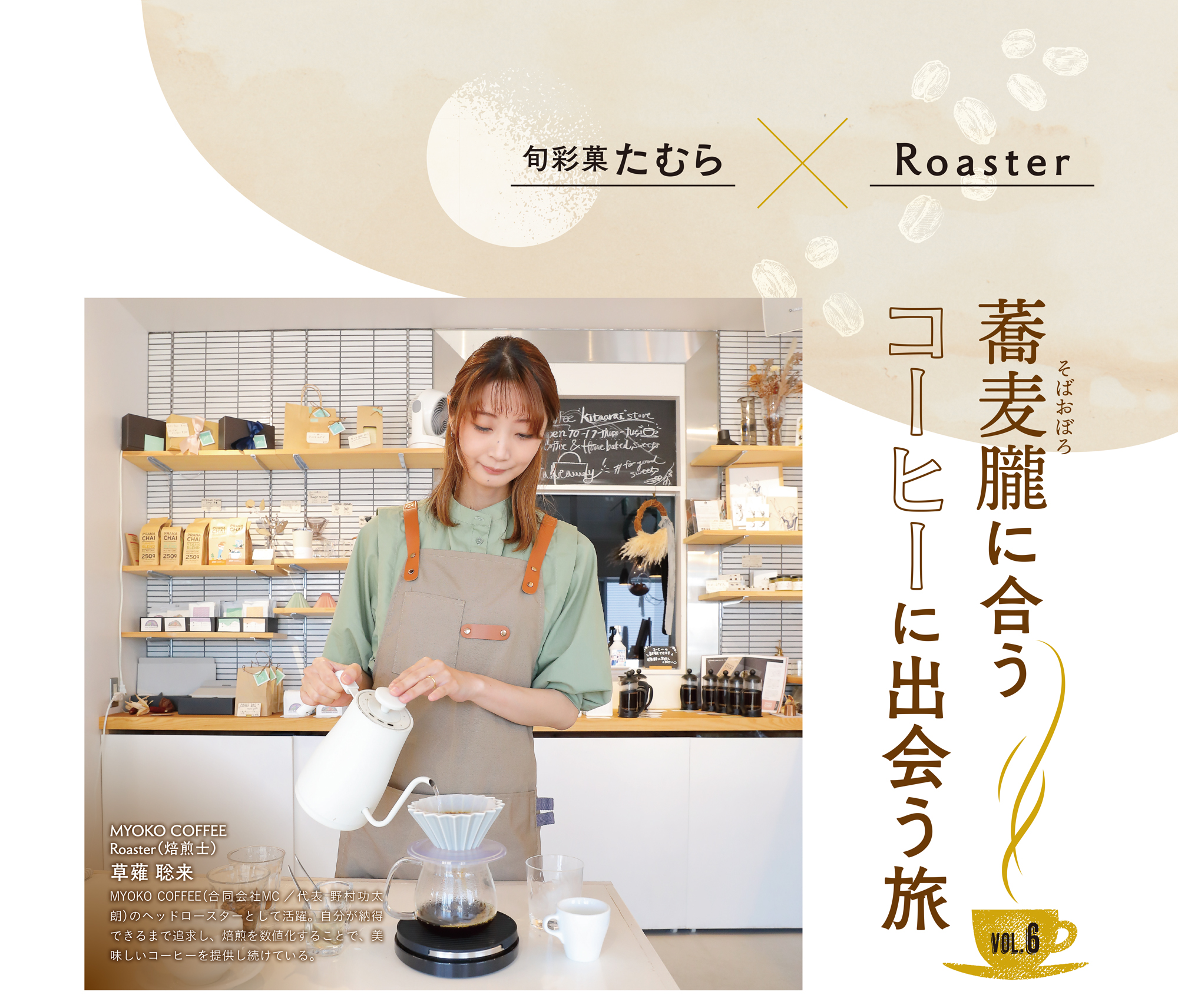 MYOKO COFFEEは、オーストラリアでバリスタをしていた野村功太朗がオープンした自家焙煎カフェです。初めはリゾートホテル内で主に観光客向けの店舗を展開していましたが、地元である妙高市新井地域の方に美味しいコーヒーを楽しんでいただきたいと、2019年12月19日に「北新井店」をオープン。提供するお菓子も自分たちで作っていますので、コーヒーとスイーツの相性については常日頃から考えています。今回、お話をいただいた「蕎麦朧」は、老舗和菓子屋さんだからこそ作れる逸品。いつもとは違う緊張感とともに、楽しくチャレンジさせていただきました。