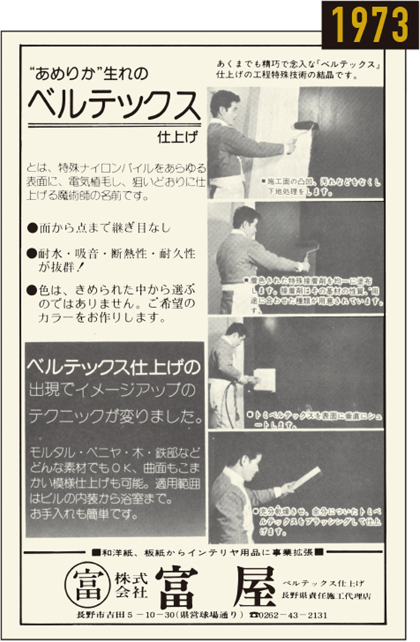 ながの情報11号(1973年10月30日発行)に掲載。社名を富屋紙店から富屋に変えると同時に、紙の卸のみならず、内装業に事業を拡張し、写真付きの広告で訴求しています。社内で職人さんを雇い、多くの企業や家屋の内装を手掛けました。