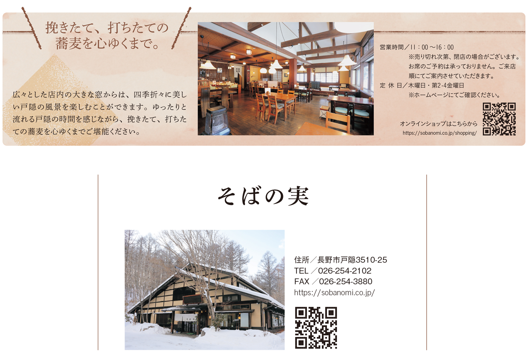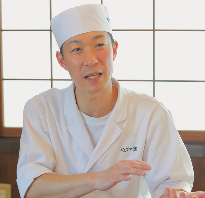 そばは気温や湿度など、四季折々、その日の状況によって少しずつ変化していきます。「一日として同じそばはない」からこそ、常にそばと会話し、手の感触でそばの声を聞きながら、丁寧にそばを打つことを心掛けています。お客様から、「おそばが好きになった」「こんなに美味しいそばを初めて食べた」などのお声をいただくと、日々の努力が報われたような気がして、また頑張ろうと思えます。お客様に五感で「戸隠」を感じていただけるよう、店内には季節の野花を飾り、器などもできるだけ地元の作家さんの作品を用いています。「そばの実」で過ごすひとときを、楽しんでいただければ嬉しいですね。