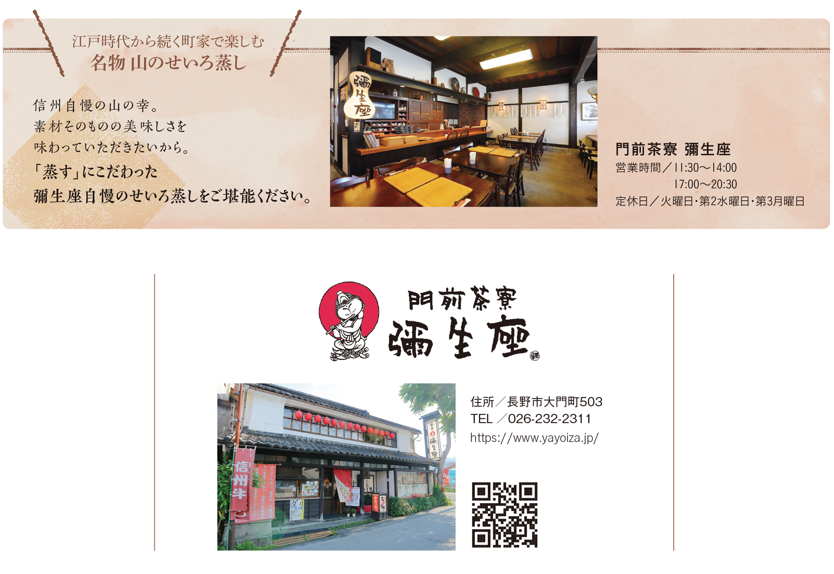 以前から、工芸店を訪れるお客様に長野の美味しいものを聞かれていた夫は、信州そばとおやきの他にも、長野の旬の味を楽しめる店が必要だと考えていました。そこで彌生座では、素材本来の味を引き出す「蒸す」という調理法に着目し、信州の旬の食材の美味しさをそのまま楽しんでいただける「山のせいろ蒸し」を考案。木曽五木のひとつであるサワラ材を使った30㎝四方の大きな「せいろ」を特注し、松花堂弁当のように四季折々の野菜や信州牛、おこわや茶わん蒸しなどを彩り良く盛り込んで蒸し上げました。初めてご来店されたお客様は皆、蓋を開けた時に立ち上る湯気や、色鮮やかな野菜に歓声を上げられます。その笑顔やお声を聞くことが、私たちにとって至上の喜びです。地域の皆さまにご愛顧いただき、「門前茶寮 彌生座」は来年30周年を迎えます。これからも、長野の郷土料理や精進料理などを活かした創作郷土料理で、信州の食文化を伝えていきたいと思います。