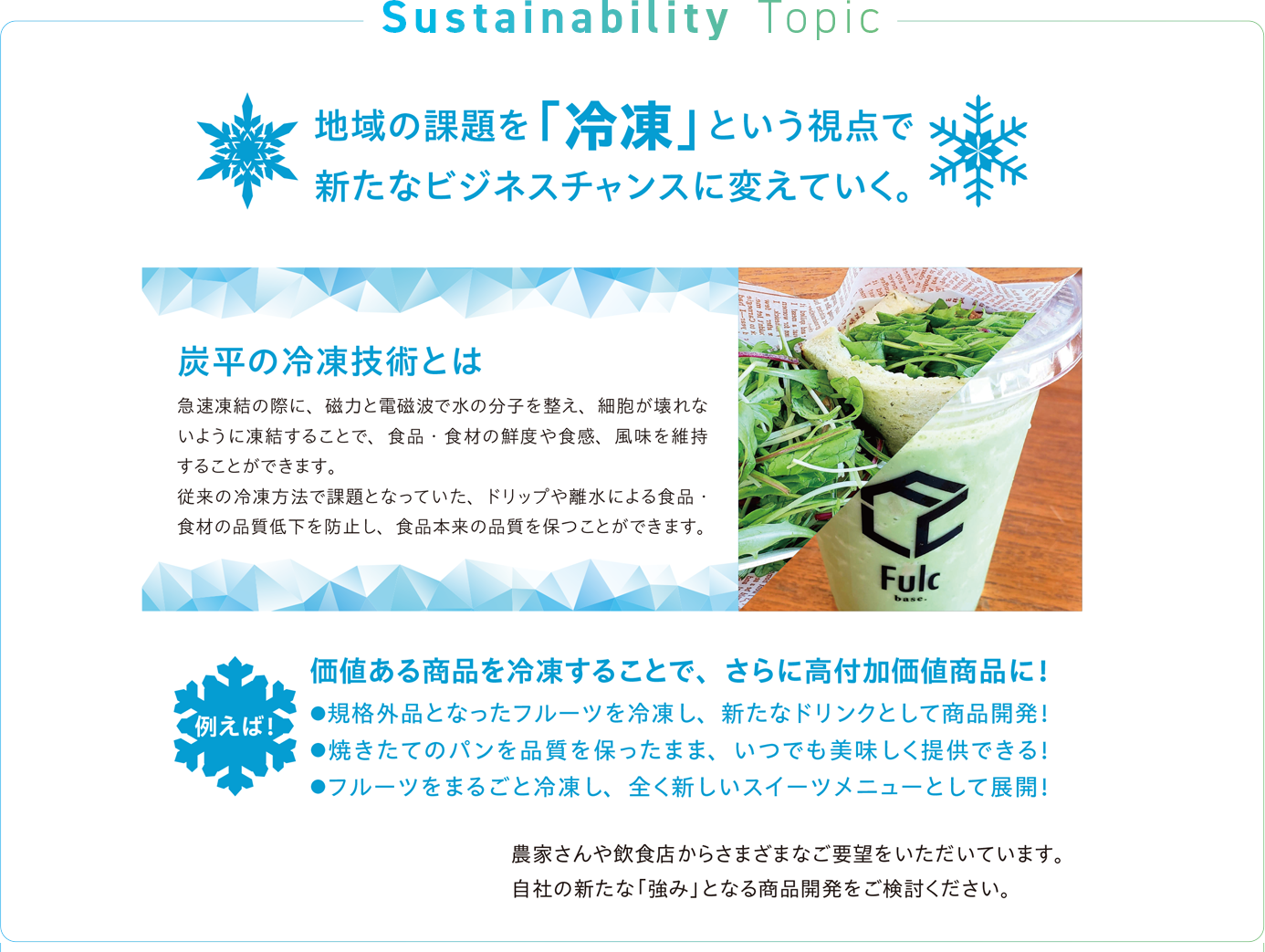 現在は、飯山市で古民家を再生した高級貸別荘事業の立ち上げと、炭平グループのひとつである「ベジ・ドリーム」が運営していた「Fulc base(フルクベース)」の再活用プロジェクトを始動しています。昭和通り添いにある「Fulc base」はコンテナをリユースしたスペースで、「ベジ・ドリーム」で栽培された水耕栽培の新鮮な野菜や、冷凍技術を活かした食材を使った飲食の可能性を提案する場でした。ここを新たに、「コンテナホテル&サウナ」にリノベーションし、新たなコンセプトで付加価値のある場所に生まれ変わらせたいと考えています。市街地のど真ん中に自分だけの空間とサウナが楽しめるって、なんだかワクワクしませんか。そんな楽しい「場」を提供することで認知度を高め、リユース活用の事例を訴求すると同時に、地域の食材や人を活かしたさまざまな提案を多発的に行うことで、地域活性化や地産地消につなげられたらと考えています。