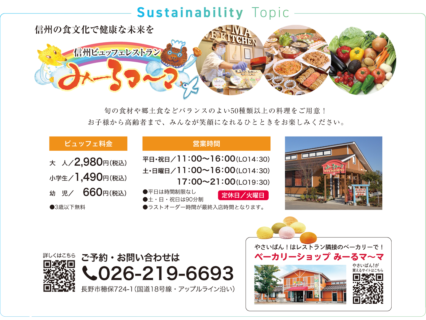 こうした取り組みや経験は、「信州ビュッフェレストラン みーるマ~マ」や「ベーカリーショップ みーるマ~マ」にも展開されています。店舗がある穂保の地は、令和元(2019)年の台風19号による千曲川の決壊で、すべてが土砂に埋まりました。非常に辛く苦しい経験でしたが、私たちがこの地に戻ることで地域全体の復興に貢献できればと、社員全員で泥を掻きだし、多くの方のご協力を得て、令和4(2022)年12月に再オープンすることができました。また、時期を同じくして自社農園も拡大し、安全・安心な農業の基準となる「JGAP」や、障がいのある方とともに農業に取り組む「ノウフクJAS」を取得。環境に優しい持続可能な仕組み作りにも着手しました。