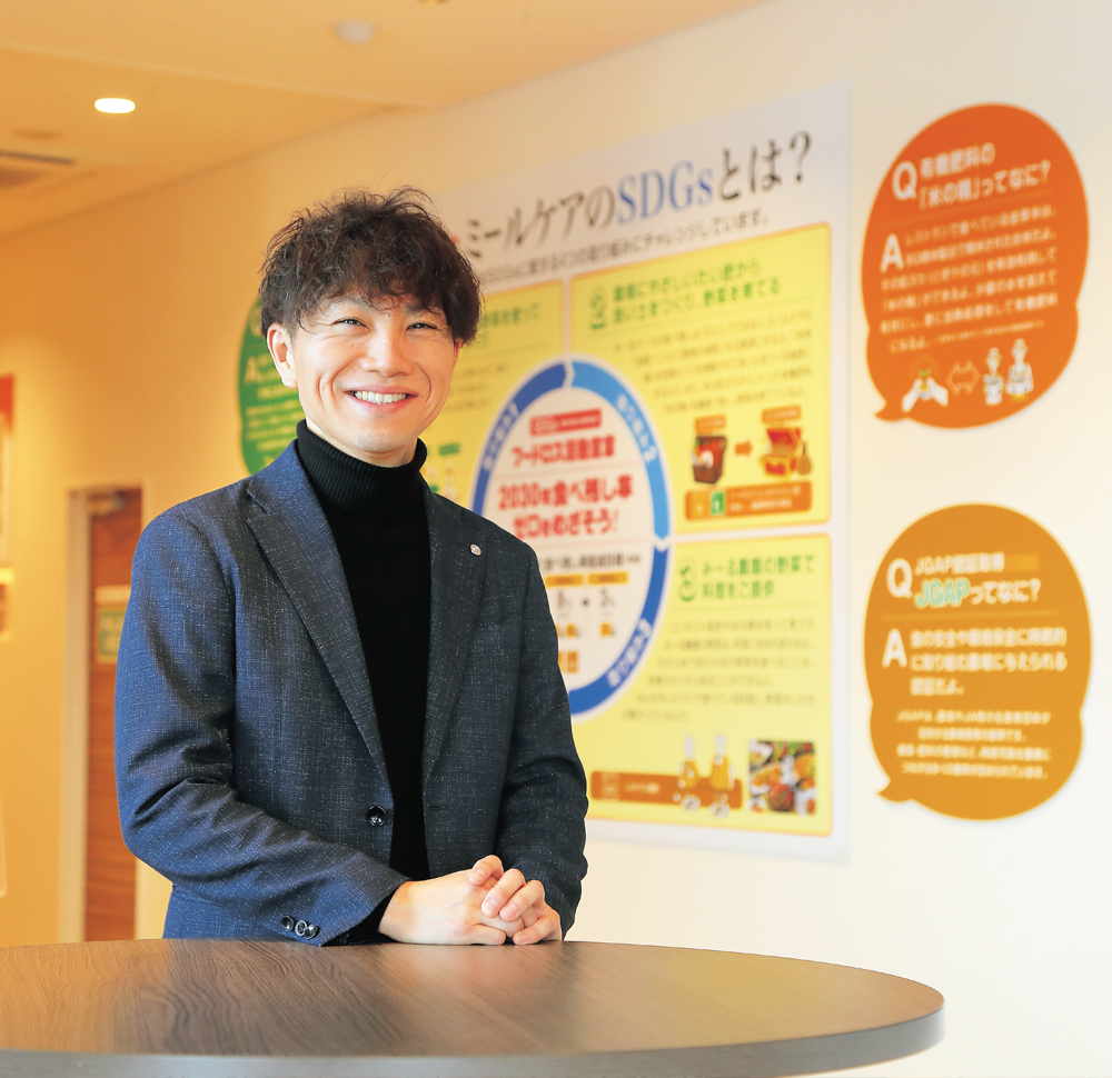 ミールケア独自の「循環型システム」は、まず地元の農家さんや自社農園で採れた規格外野菜の活用から始まりました。栄養や美味しさは変わらないのに捨てられてしまうことが多い規格外の野菜を使ってメニューを開発し、「みーるマ~マ」で提供。食べ残しは捨てるのではなく、堆肥として活用できるようにしました。ミールケアでは、この堆肥箱を「宝箱」、「未来箱」と呼んで、作られた堆肥は自社農園の土づくりに活用しています。栄養たっぷりの土壌で育てられた美味しい野菜や果物は、安全・安心なメニューに生まれ変わり、「みーるマ~マ」を訪れるお客様をお迎えするのです。この、「作る、食べる、活かす」の、いのちの輪を循環させることで、地球にも人にも優しい未来を目指し、持続可能な社会の実現に少しでも寄与できればと思っています。優しい循環から生まれた美味しい「食」で、皆さんを笑顔にすることができればこんなに嬉しいことはありません。ぜひ一度、穂保の「み~るんヴィレッジ」にも遊びにきてください。