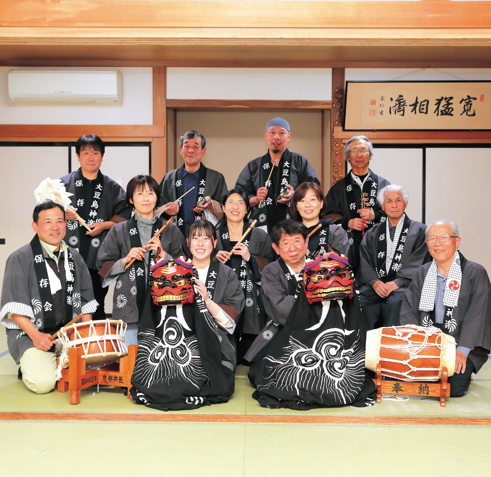 大豆島地区には「大豆島神楽保存会」のほかに、「風間神社太々神楽保存会」「東風間神楽保存会」「松岡神楽保存会」があり、交流を図りながら神楽を未来へつなぐために活動しています。私は大豆島神楽保存会のほかに、風間神社太々神楽保存会にも参加し、できるかぎり神事やイベントに参加するようにしています。