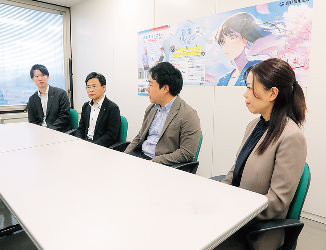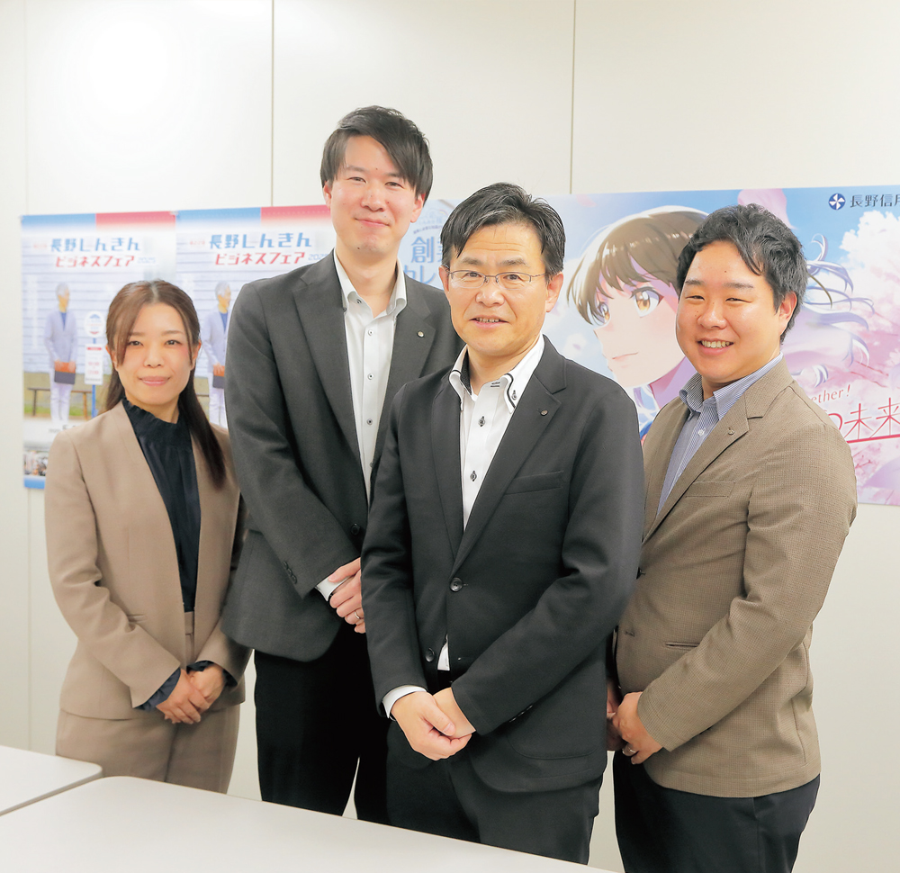 このシリーズでは、さまざまな課題解決のために、長野の企業や団体がどんな取り組みを始めているのかをご紹介します。今回は、長野信用金庫の各職場より、下平満範さん、前嶋光さん、近藤佑樹さん、田島祥子さんにお話を伺いました。