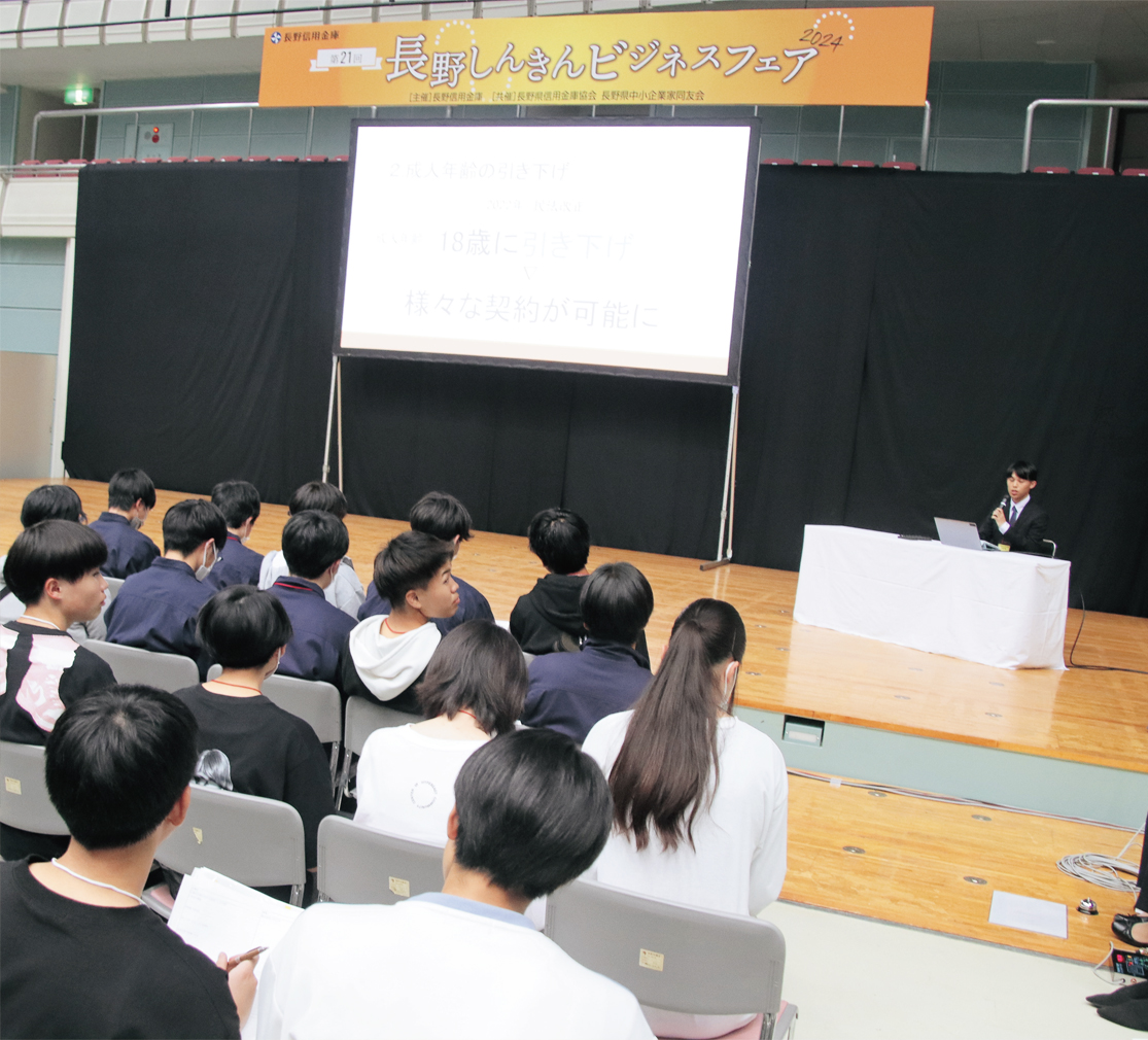 第4回では信金職員がファシリテーターとなり、学んだことをワークショップ形式でまとめ、グループごとにレポートを作成します。もっとも優秀なグループは「長野しんきんビジネスフェア」のメインステージで成果発表を行い、それを次年度、金融リテラシー講座を受講する生徒さんが見学。先輩たちのプレゼンテーションを聞くことから、次の「金融リテラシー講座」が始まっていくのです。