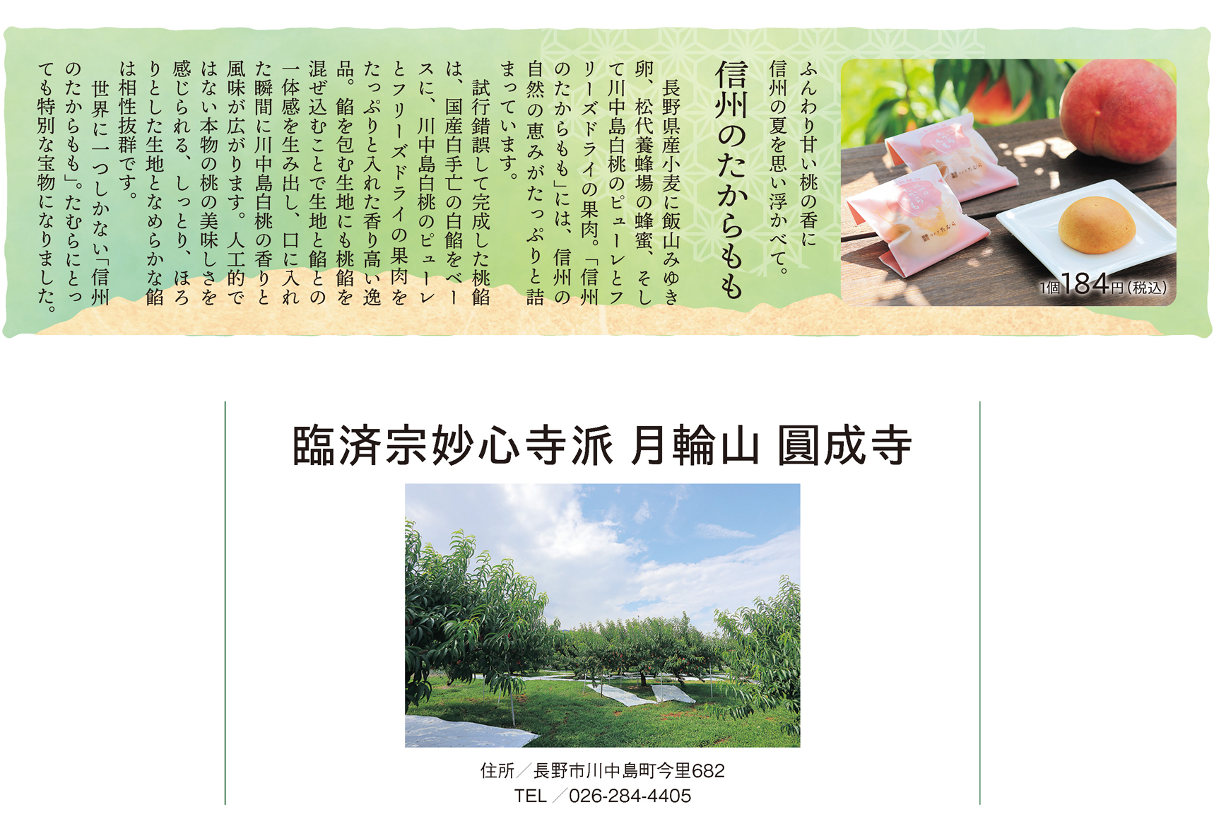 旬彩菓たむらさんとは、川中島町住民自治協議会の「川中島白桃を使ったお菓子を作れないか」という一言から、ご縁がつながりました。何度も試作を繰り返して完成した「信州のたからもも」には、川中島白桃の果肉やピューレがたっぷりと入っています。川中島白桃をもっと多くの方に味わっていただきたいと願う桃農家の「思い」を、たむらさんがぎゅっと詰めてくださいました。「信州のたからもも」を通じて、川中島白桃を全国の方に楽しんでいただければ、こんなに嬉しいことはありません。