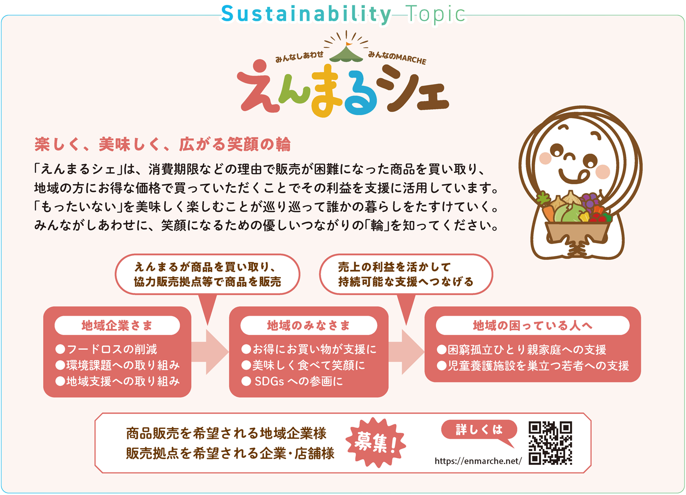そんな中、もっと多くの人が気軽に参加することで、だれもが嬉しい持続可能な支援の「仕組み」を作れないかと考えたのが、「えんまるシェ」です。これは、NPO法人えんまるが、消費期限が近くなった商品やパッケージミス等で通常の流通に乗せられなくなった商品を企業から安価で仕入れ、賛同するお店や企業に商品を設置して、一般の方に買っていただくというもの。商品売上の利益は、困窮する家庭のほか、若者や学生の支援等にも活用しています。