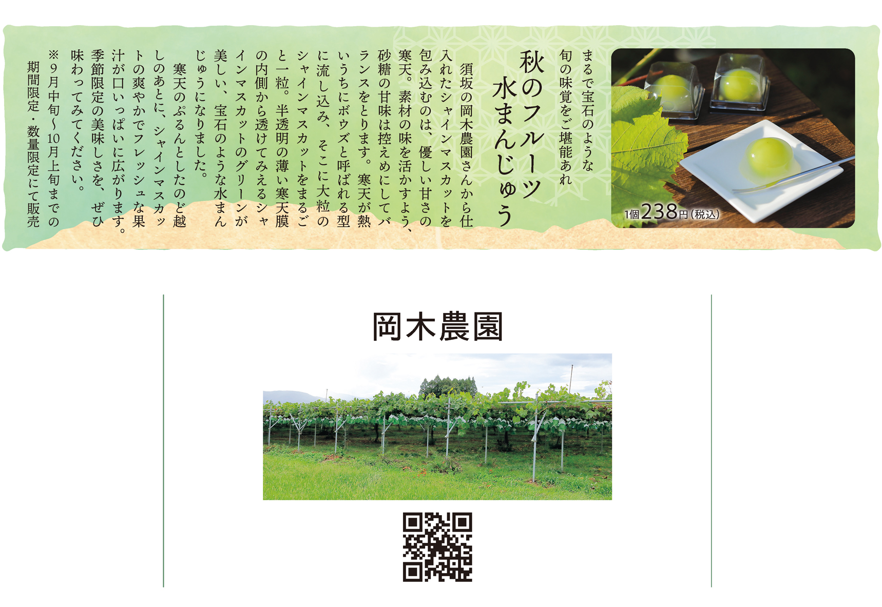 旬彩菓たむらさんとの出会いは、もう4年以上前になります。うちのシャインマスカットを気に入ってくださり、お菓子を作りたいとご連絡をいただきました。出来上がった「水まんじゅう」を食べた時はびっくりしましたね。素材を活かしながらシャインマスカットの新しい味わい方を提案していて、私たちが育てたぶどうの一粒一粒を大切に扱っていただけているのが本当に嬉しかったです。たむらさんのお菓子を通して、岡木農園のぶどうを多くの人に味わっていただける幸せを感じています。